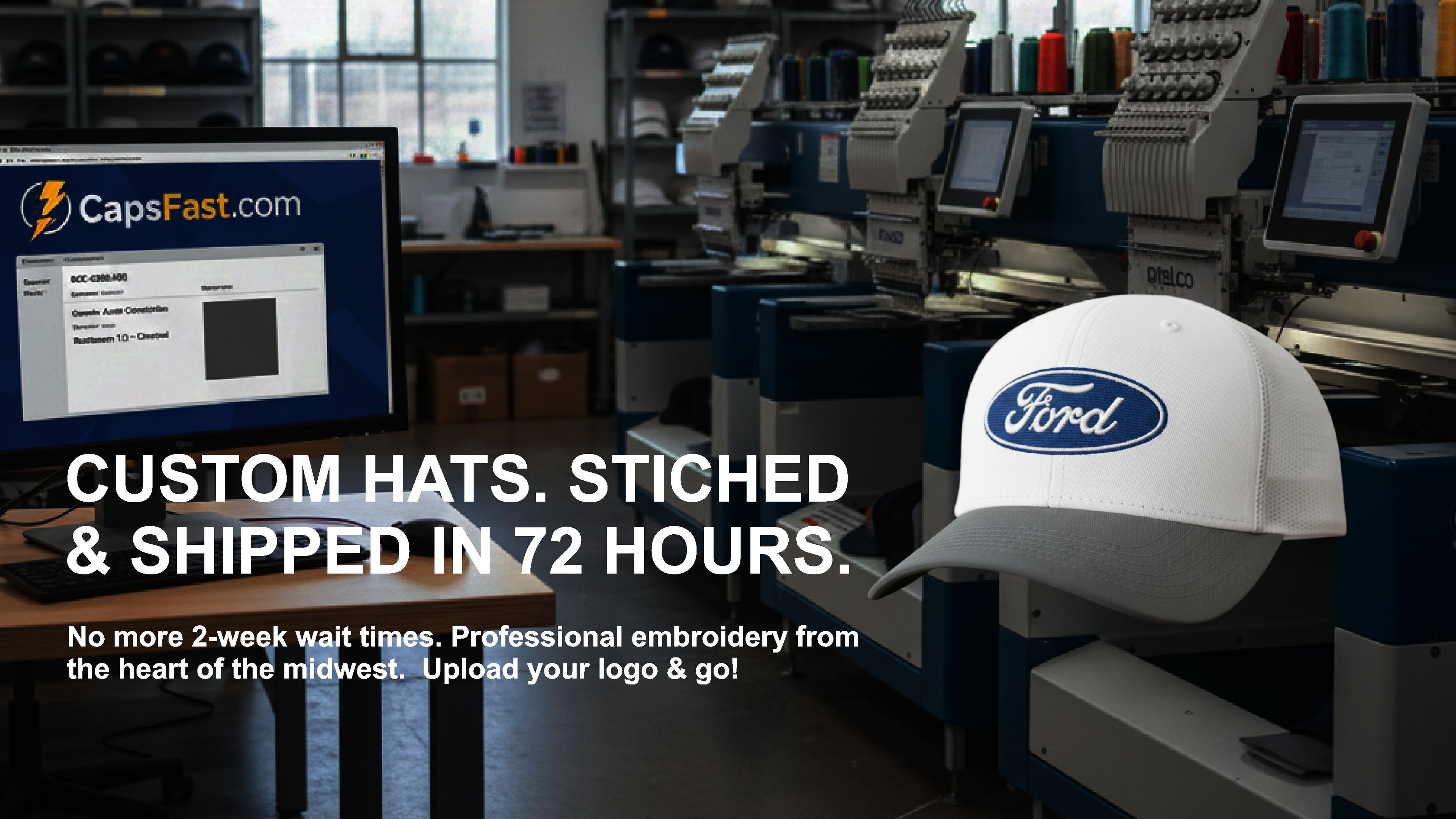 Tired of waiting 3 weeks for a tracking number? We built CapsFast to solve the "slow gear" problem. From our production floor in central Illinois, to your doorstep—we guarantee 72-hour production on every approved order. No hidden fees, no "lost" emails, just fast, professional embroidery.